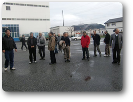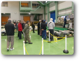 概要説明の後、硬質クロムめっき自動ロボット、大型硬質クロムめっき槽、研削、研磨機等々を見学させていただきました。現場に入ると様々な業種のワークがそこここに・・・目に見えないところで、最先端テクノロジーを支えている「表面処理技術」の真髄を垣間見たような気がします。藤井会長様はじめ多くの方々に分かり易くご説明いただきました。